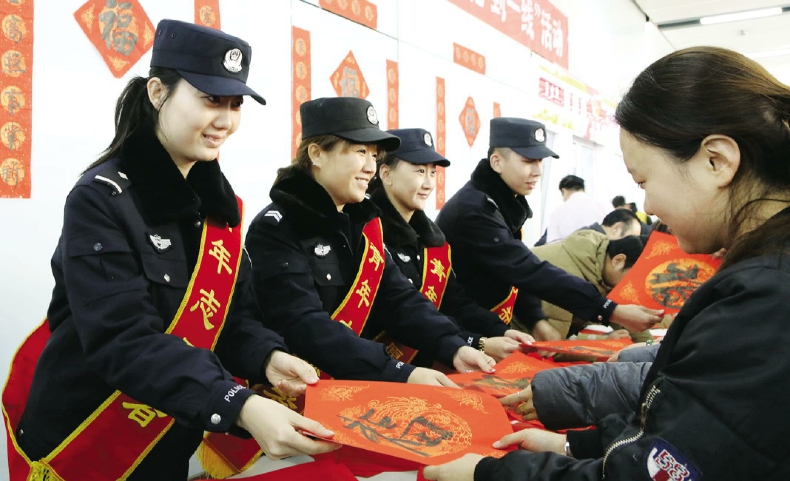 春运期间,包头铁路公安处组织民警在包头火车站候车大厅挥毫泼墨,书写春联和“福”字,送给过往的旅客,向广大群众送上平安出行的美好祝福。