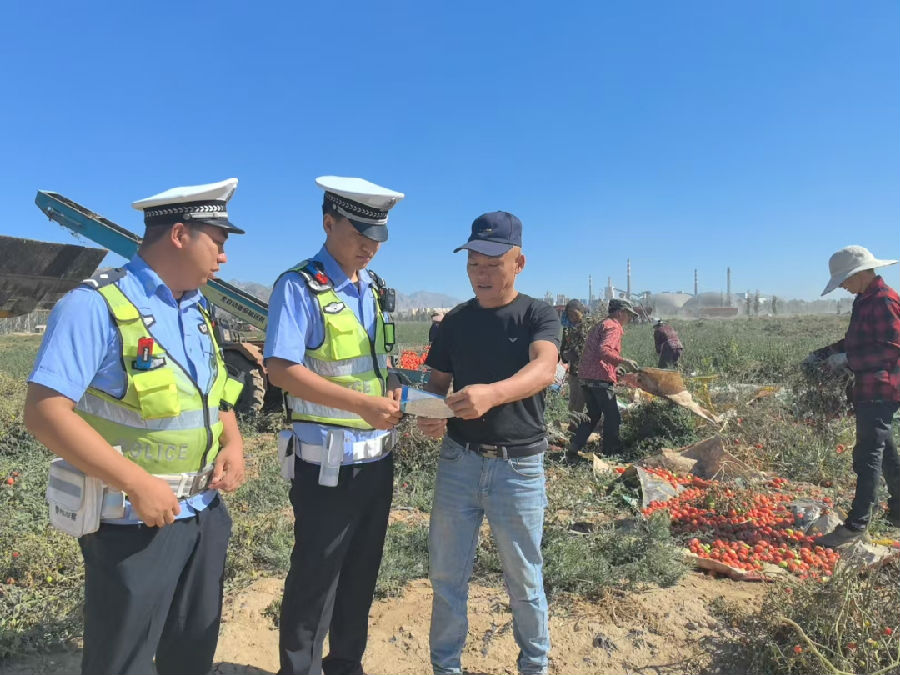 时值秋收时节,巴彦淖尔市公安局交管支队乌拉特后旗大队组织民警深入辖区麒麟瓜种植基地、番茄种植基地等重点区域,开展精准化、滴灌式交通安全宣传。