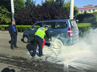 包头讯“警察同志,快帮帮忙,汽车轮胎起火了!”近日,自治区公安厅交管局高速公路三支队包头大队民警在包头东收费站执勤时,发现一辆小轿车匆匆驶来,驾驶人将车辆靠边停下后,快步跑向交警求助。