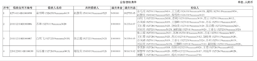 内蒙古丰鑫投资有限公司与内蒙古森云汽贸有限公司特此公告通知债务人、担保人及其他相关各方上述已转让的事实:自本公告发出之日起,内蒙古森云汽贸有限公司作为上述债权的合法受让人,已依法取得上述债权,现依法向各债务人、担保人和其他义务人或继承人进行催收,请各债务人、担保人和其他义务人,或债务人、担保人和其他义务人的权利义务继承人,向内蒙古森云汽贸有限公司履行主债权合同及担保合同约定的偿付义务或相应的担保责任或法院裁定文书所确定的义务(若债务人、担保人因各种原因更名、改制、歇业、吊销营业执照或丧失民事主体资格的,请相关承债主体或主管部门代为履行清算责任)。