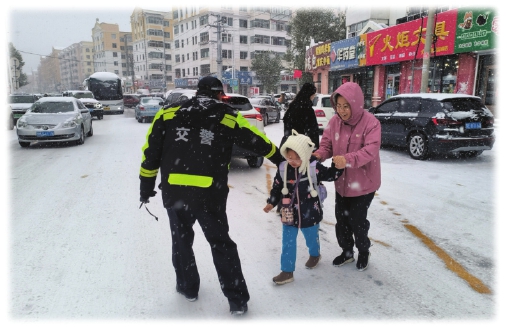 在保障道路畅通的同时,执勤民辅警积极开展交通疏导工作。风雪中,中心城区大队南卡中队执勤民辅警一边引导送学车辆“即停即走”,避免造成交通拥堵,一边提醒学生和家长注意脚下路滑,有序入校。他们忙碌的身影、温暖的叮嘱,让寒冷的冬日充满了温情。