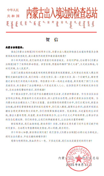 值此《内蒙古法制报》创刊40周年之际,内蒙古出入境边防检查总站谨向贵报及全体新闻战线的亲密战友,致以最热烈的祝贺和最崇高的敬意!