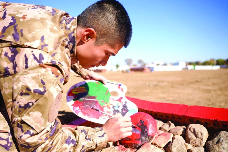 近日,武警内蒙古总队新兵团组织开展了“石映兵心”创作绘画活动,让笔墨与初心在石上相遇。课余时间,新训官兵以石为纸,围绕忠诚、传承等主题,将强军信念绘成多彩画卷。