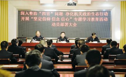 同时,韩万平强调:要从严从实推进两项工作,着力打造“忠诚、干净、担当”的民警职工队伍。要将“坚定信仰、信念、信心”专题教育常抓不懈,作为党建工作和思想政治教育的永恒主题久久为功;“四官”问题绝不仅仅是作风问题、能力问题,更是政治问题、党性问题、官德问题,是初心不在、信仰不真、党性不纯的表现,必须以高度的政治责任感重拳整治。要抓好学习教育,拧紧“总开关”。学《党章》,学《公务员法》,学政策,学业务,学党纪党规。用好思想建党这个传家宝,扭住思想政治建设这根生命线,把思想理论武装放在首位;要抓好自查自纠,查问题纠顽疾。每个党员干部都要像整治“四风”那样,逐一对照“四官”的主要表现形式,开展严肃认真的自查自纠,对身上的顽疾进行一次彻底的大排查、大扫除;要抓好整改落实,盯住“改”字不放。对“整改清单”上明确的整改事项,不达目的不罢休,不改到位不收兵,决不能出现“烂尾工程”,决不能失信于民;要抓好建章立制,规范权力运行。以改革创新精神推进反腐倡廉建设,构建干部不敢腐的惩戒机制、不能腐的防范机制、不易腐的保障机制,要从源头上纠正和防止“四官”问题。积极推行工作日志制度、单位和部门工作台帐和工作目标倒逼管理制度,要建立问题发现预警机制、监督举报和信访接待通畅机制、问题线索移送机制,要健全从优待警激励机制等。