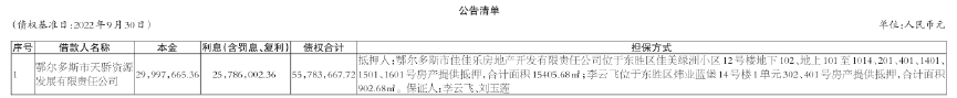 注:1、本公告清单仅列示截至转让基准日的贷款本金、利息,借款人和担保人应支付给呼和浩特市利米号商贸有限公司的利息、罚金、违约金及其它应付款按借款合同、担保合同及中国人民银行以及生效法律文书确定的方式计算,实际计算与欠息金额不一致,以实际计算为准。若已经进入诉讼程序,并已由原债权人垫付的应由借款人及担保人负担的公证费、律师费、诉讼费、执行费、评估费等以有关法律文书和正式发票确定的金额为准。