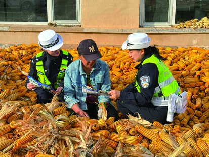 秋收时节,农用车流量激增,交通安全风险加大。为此,巴彦淖尔市公安交管部门科学布警,将管理重点向农村地区倾斜,全力打好“保畅+护安”组合拳--在国省道、县乡道路重点路口设立服务点,为农用车、三轮车、拖拉机免费粘贴反光标识,现场讲解“被看见”的重要性,从源头上防范夜间追尾事故;在严格查处农用车违法载人、酒驾醉驾、超载超速等严重违法行为的同时,对占道晒粮等行为,坚持以教育劝导、帮助清理为主,引导农户到指定区域晾晒,确保实现安全与生产的平衡;通过发放宣传册、组建微信群等方式,常态化宣讲交通安全知识,强调“一盔一带”的重要性,引导群众养成文明出行习惯。