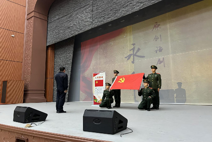 随后,全场党员在韩黉亮的带领下肃然起立,举起右拳重温入党誓词,“我志愿加入中国共产党……”铿锵有力的誓言回荡在剧场上空,每一字每一句都饱含着对党的无限忠诚。老党员们眼中闪烁着追忆的光芒,仿佛回到了那段激情燃烧的峥嵘岁月,年轻党员们则神情坚定,目光中透露出对未来的无限憧憬与忠诚履职担当的决心,这一刻,入党初心被深深唤醒,使命担当在每个人心中激荡。