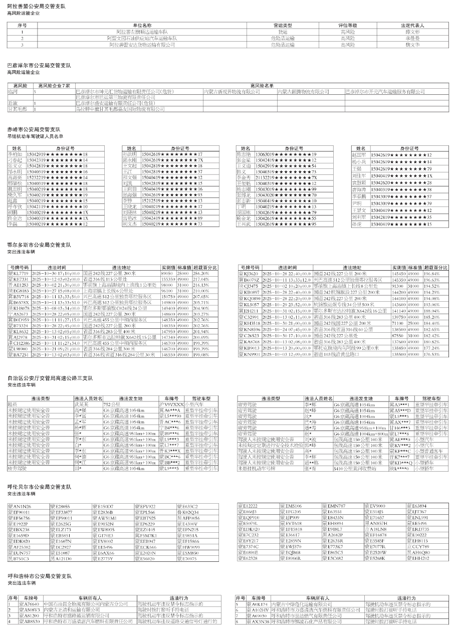 全区公安交管部门查处违法车辆、企业、行为人等曝光名单