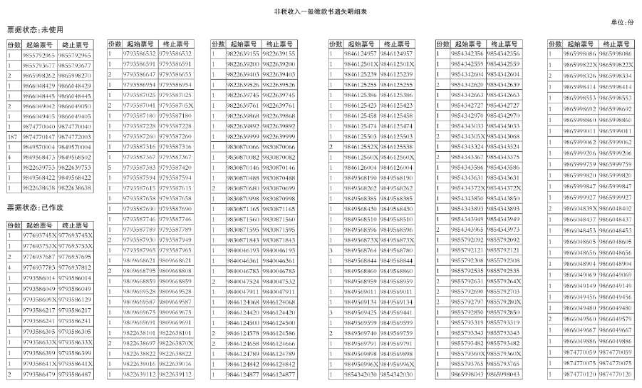 内蒙古自治区财政厅资产管理处、内蒙古财政厅国有资产监测中心在对自治区非税收入管理系统内、外财政票据梳理过程中发现,共计414份非税收入一般缴款书遗失(详见附件),现声明作废。特此声明。