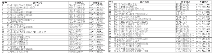 为进一步加强单位银行结算账户管理,有效防范账户洗钱涉诈风险,根据《中华人民共和国反洗钱法》《人民币结算账户管理办法》(中国人民银行令〔2003〕5号)及《内蒙古农商银行关于开展单位银行结算账户清理工作的通知》(〔2025〕145号)要求,内蒙古农商银行根河支行将对以下一年以上未发生收付活动、营业执照注销或被吊销的单位银行结算账户按照相关规定进行统一清理。我行始终坚持以客户为中心的原则,充分保障存款人资金安全,切实维护金融消费者合法权益,此次公示期为30天。