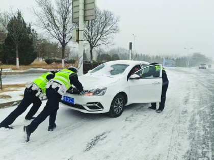 12月12日,高新区迎来降雪天气。当天,高新区公安分局交管大队民警在辖区巡逻途中,遇到一辆白色吉利小轿车停在道路中央,经询问得知,该车行驶中熄火,无法启动。