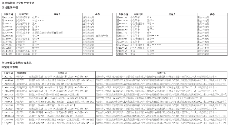 全区公安交管部门查处违法车辆、企业、行为人等曝光名单