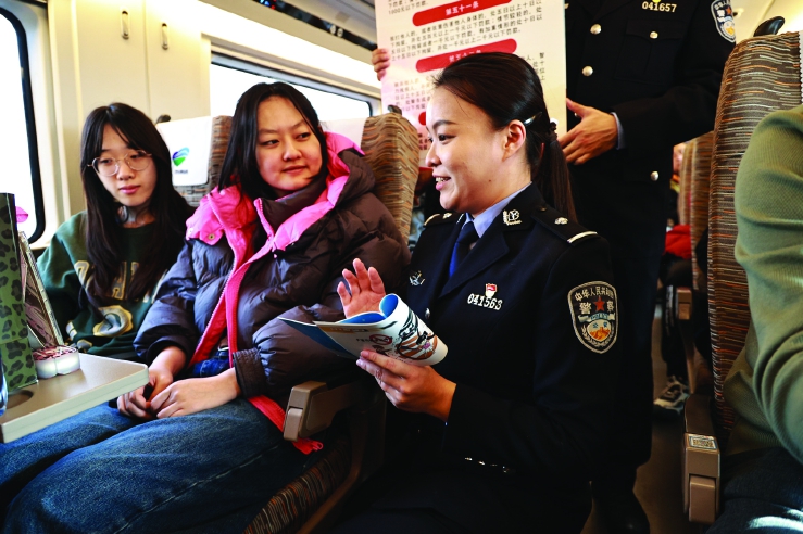 在第六个中国人民警察节来临之际,包头铁路公安处组织民警在列车上开展“警心护旅途平安伴你行”主题普法宣传活动,为旅客送上一份特殊的安全“大礼包”。