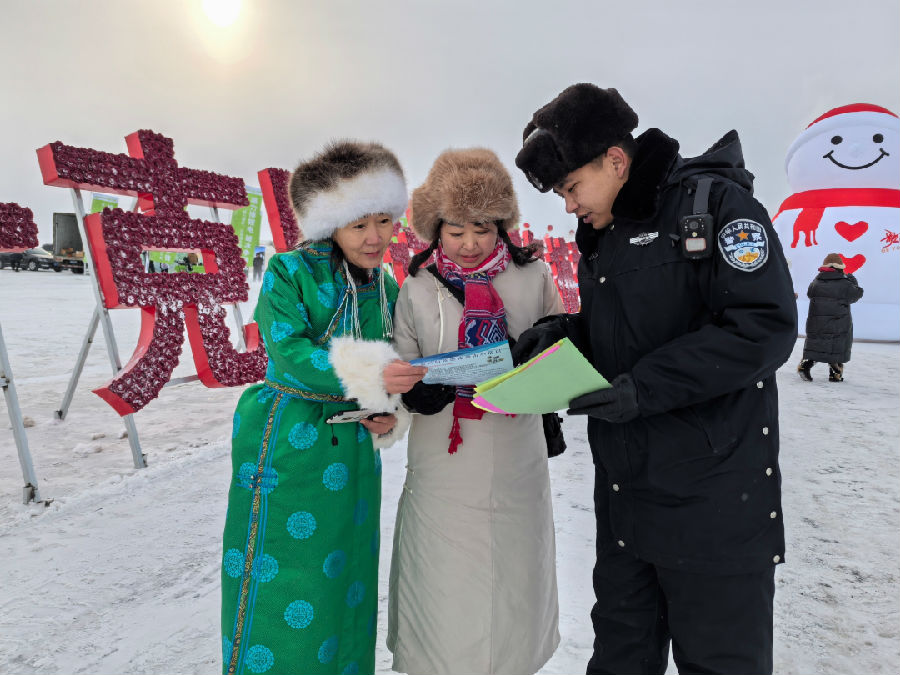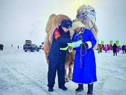 1月17日,赤峰市克什克腾旗冬捕节隆重开幕,达里湖冰面上热闹非凡。锡林浩特铁路公安处经棚站派出所干警不仅守护着通往盛会铁路动脉的安全,还将普法阵地前移至冬捕节活动现场。民警们通过讲解法规条款、倡导文明安全游玩,让游客在感受渔猎文化的同时体验法治温暖,为冰雪盛宴增添了一道别样“警”色。