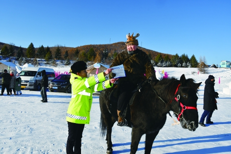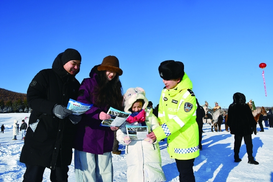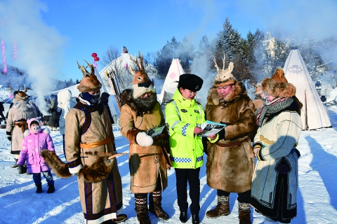 近日,来自全国各地的游客与鄂伦春族群众同游同乐、载歌载舞,尽情感受岭上冰雪“伊萨仁”的独特风情。呼伦贝尔市鄂伦春自治旗公安局以此为契机,组织警力深入景区核心区域,通过精准宣传将安全知识送到游客身边,并同步开展应急救助服务,用暖心守护保障冰雪盛会。