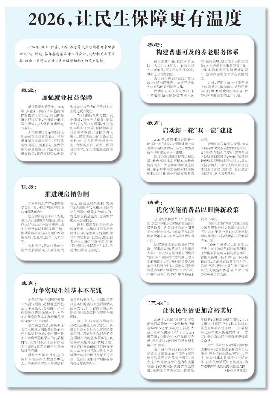 2026年,就业、住房、医疗、养老等民生领域将迎来哪些新变化?近期,各部委密集召开工作会议,进行相关部署安排,推出一系列与百姓日常生活密切相关的民生举措。