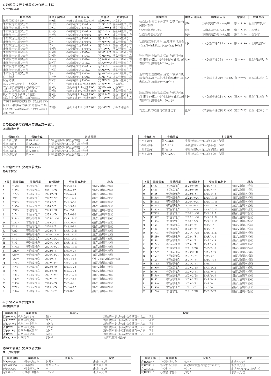 全区公安交管部门查处违法车辆、企业、行为人等曝光名单
