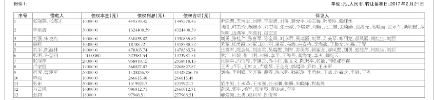 内蒙古中瑞信息咨询服务有限公司、特此公告通知《贷款债权明细》所列贷款人、抵押人、担保人该债权转让的事实。请上述贷款人、抵押人及担保人抓紧筹措资金,在本公告发布之日起15日内向李帅履行债权合同、担保合同约定的还本付息、给付债权实现费用之义务及相应的担保责任。否则将依照法律规定及合同约定采取法律措施(联系人:李帅,身份证号:152722198707022738,联系电话:13604771578,地址:鄂尔多斯市东胜区铭鑫家园E区4号商业)。