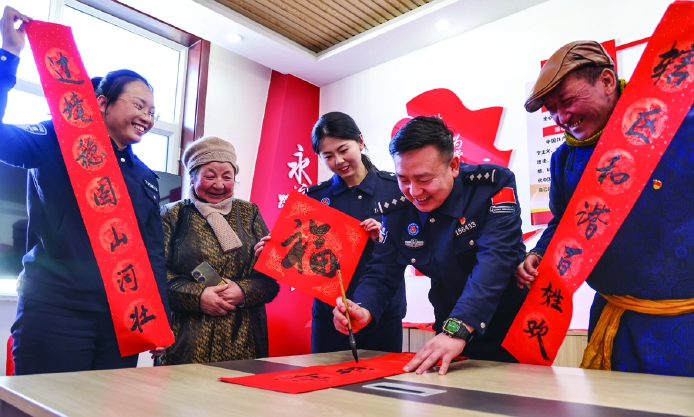 春节将至,在巴彦淖尔边境管理支队甘其毛都边境派出所,民警为辖区群众书写春联,送上辞旧迎新的美好祝福。一笔一划里融进警民同心,一纸一墨间谱写平安愿景,这一幕定格为边境线上最温暖的瞬间。 赵瑞斌李文超摄