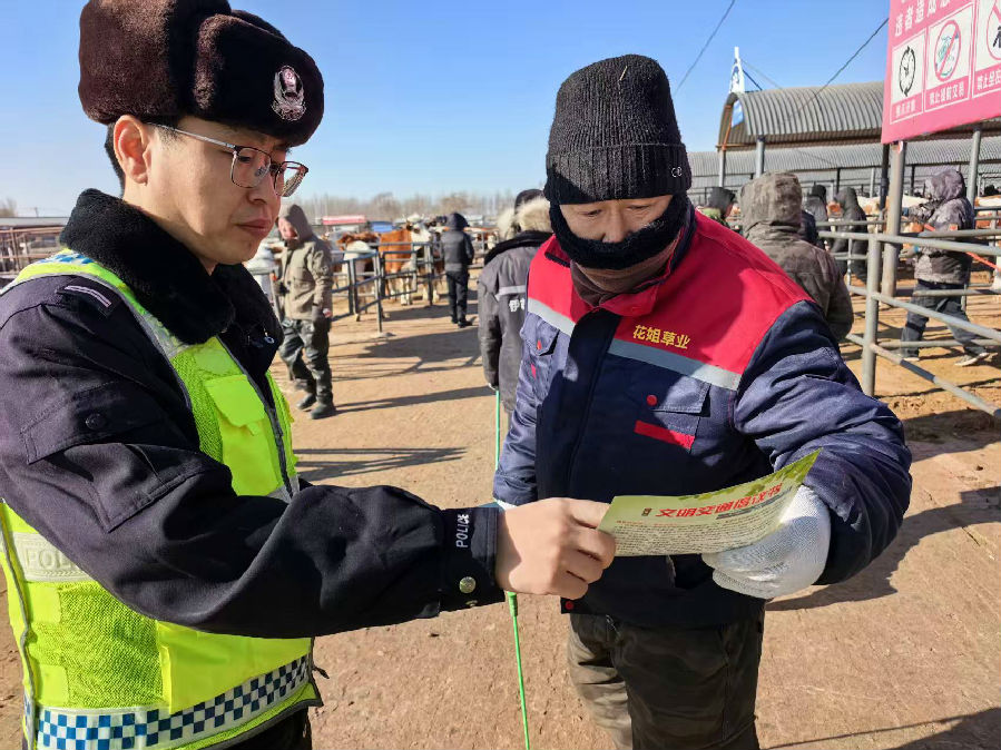 近日,通辽市科左后旗公安局交管大队民警走进伊胡塔镇牛市开展交通安全宣传活动。活动中,民警向商户和过往群众大力普及交通安全知识,叮嘱大家在牲畜运输、出行返乡时拒绝乘坐超员车、不驾驶带病车,做到不酒驾、不超员、不超速、不抢道,确保平安回家过大年。 郭启杰摄