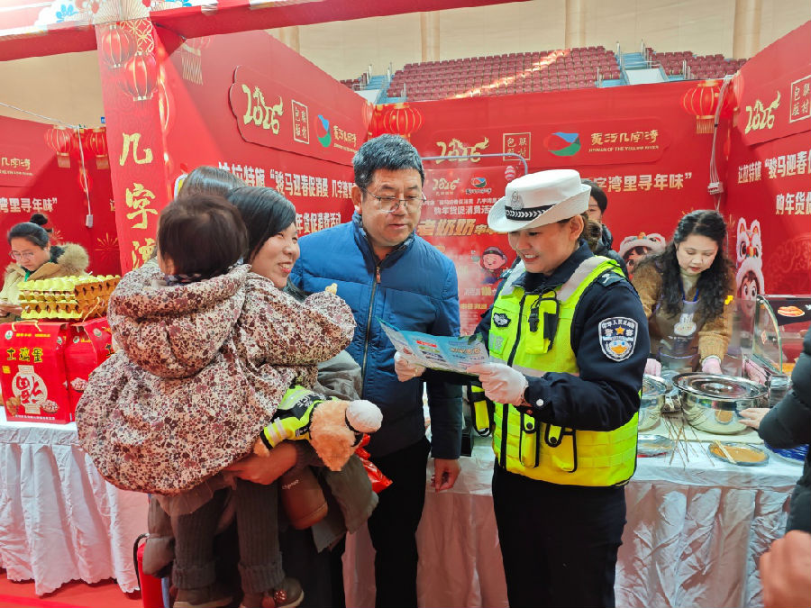 近日,鄂尔多斯市公安局交管支队达拉特旗大队组织民辅警走进辖区年货节现场,开展接地气的交通安全宣传活动,将平安出行理念融入浓浓年味。活动中,民辅警用通俗易懂的语言讲解冬季道路行车安全常识,重点普及酒驾醉驾、超员超载、骑乘电动车不戴安全头盔等交通违法行为的危害,让平安成为群众心中最暖心的“年货”。