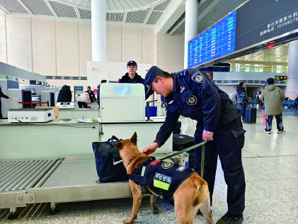 当排查到一只被透明胶带反复缠绕加固的瓦楞纸箱时,它突然定住,耳朵倏然向前竖起,鼻尖紧贴纸箱封口的胶带边缘,而后悄无声息地原地卧下,目光坚定地望向芦宏伟,这是它最标准的示警信号。芦宏伟立即上前询问旅客,同时认真检查该纸箱。当他小心翼翼地打开纸箱封口,被一层层包裹在黑色塑料袋里的烟花爆竹呈现眼前,一场危及群众生命财产安全的隐患被成功排除。从胖虎示警到完全排除隐患,整个过程不到三分钟。