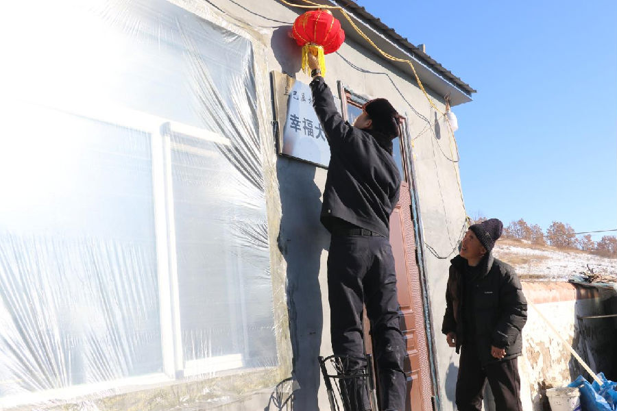 民警给群众挂上红灯笼。