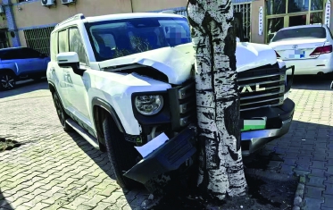 近日,在鄂尔多斯市纳林陶亥镇某饭店门前道路上,一辆轿车在正常停车过程中,突然毫无征兆地加速冲向路边的树木。随着“砰”的一声巨响,轿车车头被撞得面目全非,引擎盖隆起、保险杠碎裂,驾驶人仅受轻微擦伤,侥幸逃过一劫。