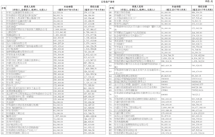 根据内蒙古呼和浩特金谷农村商业银行股份有限公司与中国长城资产管理股份有限公司内蒙古自治区分公司签署的《资产转让合同》,内蒙古呼和浩特金谷农村商业银行股份有限公司于2017年11月22日将清单所列债权(包括对公告清单所列借款人及其担保人享有的主债权及借款合同、担保合同、抵债协议、还款协议和其他相关协议项下的全部权利)依法转让给中国长城资产管理股份有限公司内蒙古自治区分公司。