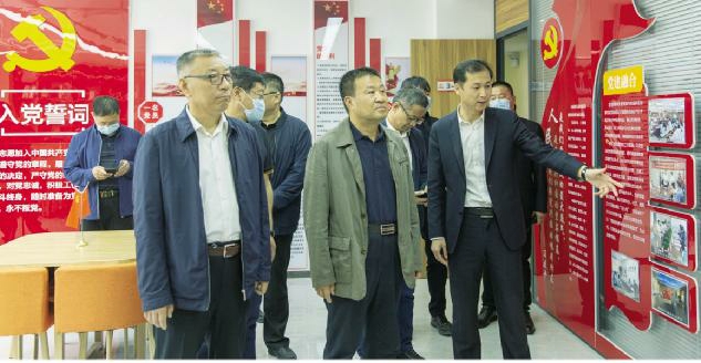 赤峰金地恒通物业有限责任公司经理姜林(右一)向市区领导介绍公司党建融合开展情况。