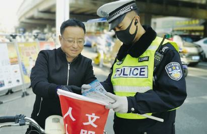 结合当前正在开展的“坚持政治建警、全面从严治警”教育整顿,近日,呼和浩特市公安局交管支队新城区大队宣传股联合四中队在公安厅路口开展了“一盔一带”主题宣传活动。期间,民警通过发放宣传材料、摆放宣传展板等方式,教育引导广大非机动车驾驶人按照规定佩戴安全头盔,自觉遵守交通法规,安全文明出行。 柴红王永明摄