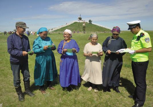 日前,呼伦贝尔市新巴尔虎左旗公安局交巡警大队抓住当地举行“甘珠尔庙会”活动这一契机,深入开展交通安全宣传,通过发放交通安全宣传单、讲解夏季出行注意事项,切实增强广大游客和牧民群众的交通安全意识。