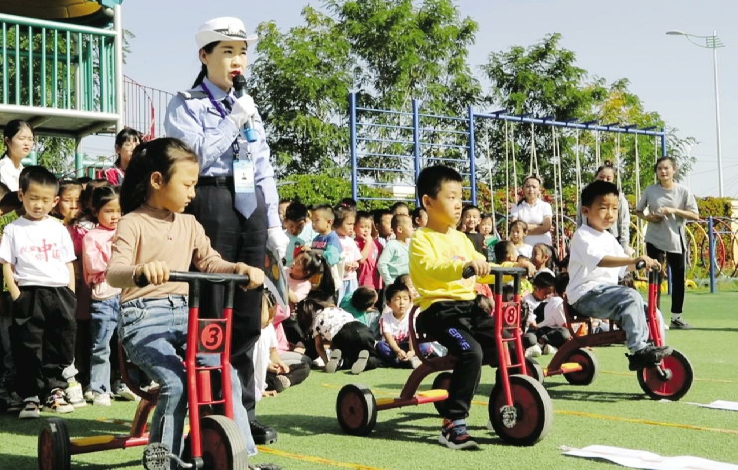 近日,巴彦淖尔市五原县馨悦幼儿园里热闹非凡,交警把马路“搬”进幼儿园,孩子们玩儿得兴高采烈。民警首先用通俗易懂的语言给孩子们讲解了常见的交通标志以及如何避让车辆、安全行走等交通安全知识。随后,民警带着孩子们来到操场上,将孩子们分为“骑行小组”和 “步行小组”,通过做游戏的方式现场模拟过马路,“红灯停、绿灯行,黄灯亮了等一等”“过马路要走斑马线”……在轻松快乐的游戏过程中,孩子们学到了交通安全知识,不知不觉中,交通安全的种子已悄然播撒在他们心中。