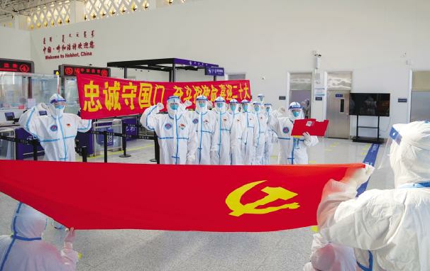 “我志愿加入中国共产党,拥护党的纲领,遵守党的章程,履行党员义务……”6月30日上午,呼和浩特出入境边防检查站执勤二队全体党员民警高举右拳,面对鲜红的党旗庄严宣誓。“忠诚守国门,奋斗担使命,喜迎二十大”主题党日活动,在呼和浩特白塔国际机场入境大厅拉开了帷幕。“佩戴党徽我带头”,该站值班领导王国华将一枚枚特制的党徽“佩戴”到全体党员的防护服上,要求每名民警自觉在执行勤务任务时统一佩戴党徽,主动亮明身份,强化责任担当,接受群众监督。 塔娜摄