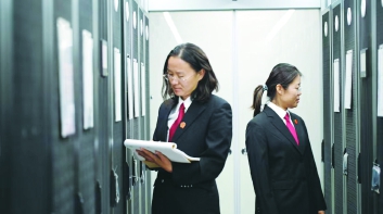 网络中心工作人员巡检机房。