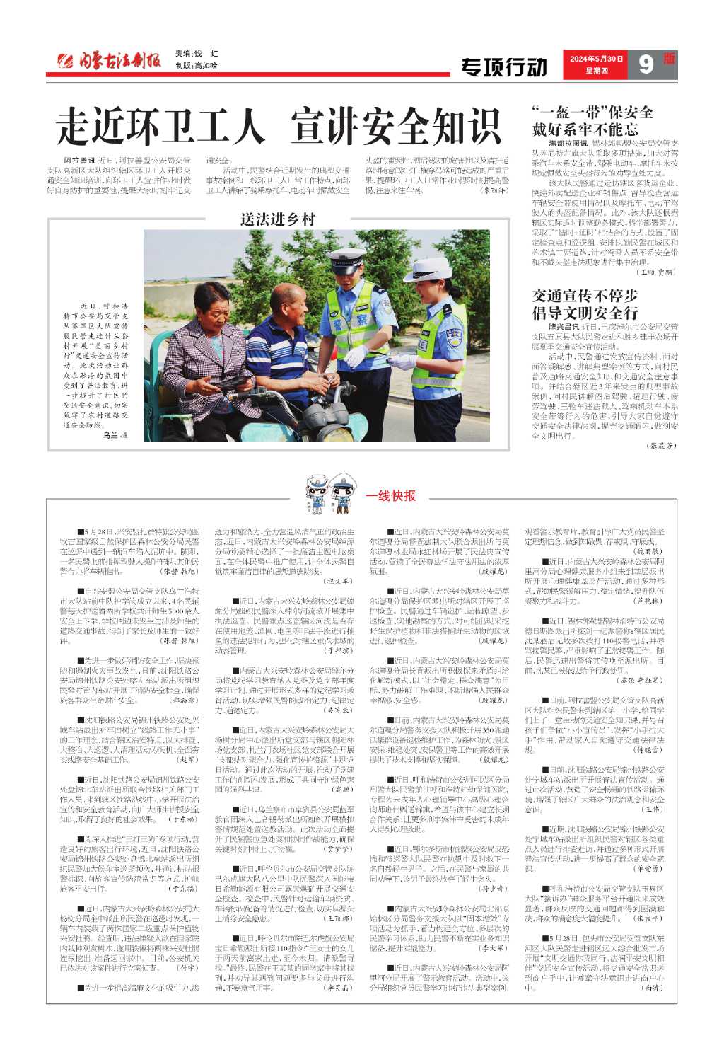 ■自兴安盟公安局交管支队乌兰浩特市大队站前中队护学岗成立以来,4名民辅警每天护送着两所学校共计师生5000余人安全上下学,学校周边未发生过涉及师生的道路交通事故,得到了家长及师生的一致好评。 (张静韩旭)