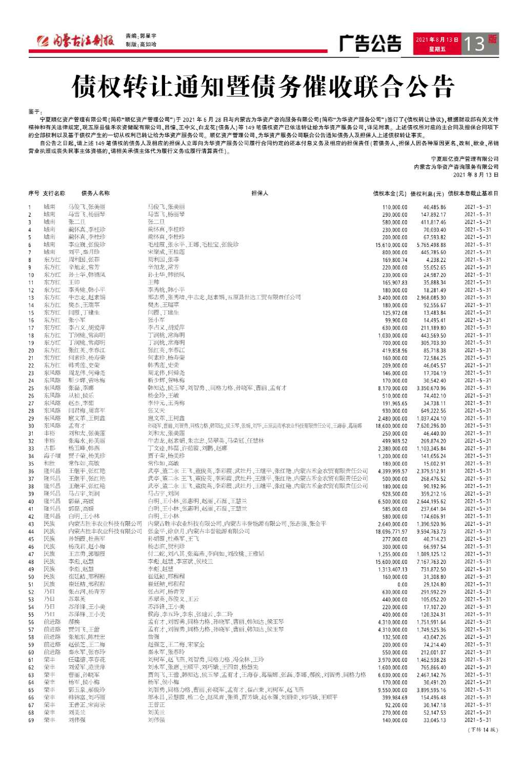 债权转让通知暨债务催收联合公告